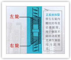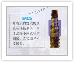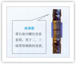 直螺紋套筒三大系列及連接示意圖:標(biāo)準(zhǔn)型(正常情況下的鋼筋連接),正反絲扣型(用于兩端鋼筋均不能轉(zhuǎn)動(dòng)的場(chǎng)合), 異徑型(用于不同直徑的鋼筋連接)